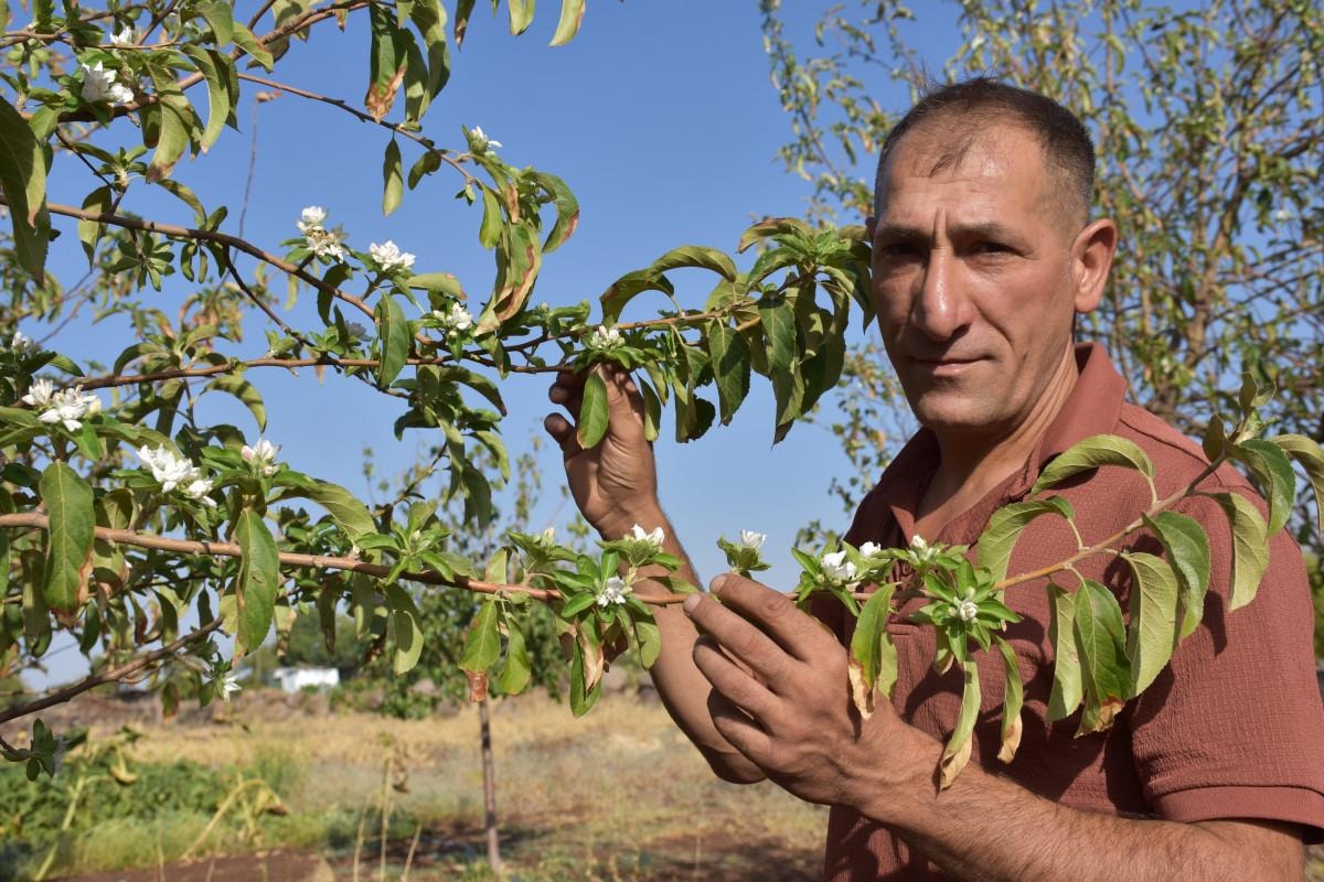 Siverek ilçesine bağlı Dicle Mahallesi'nde bulunan bir bahçedeki yaklaşık 10 elma ağacı, meyve mevsiminde yeniden çiçek açtı.