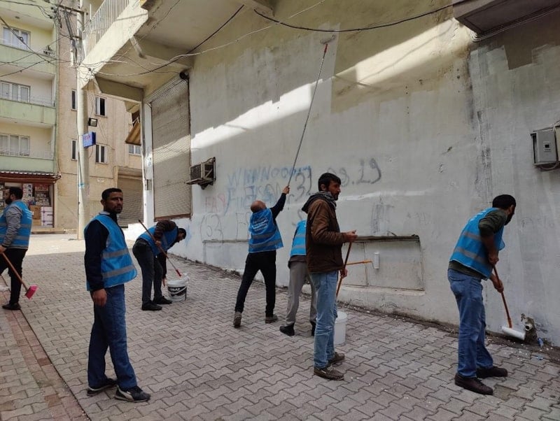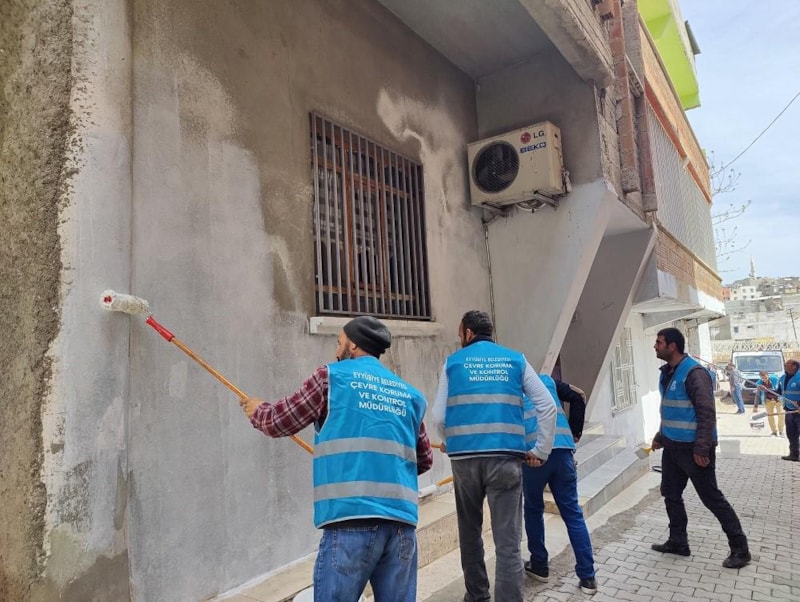 Kurumanın ardından yine yüzlerce çalışanın katılımıyla sokaklara inen Eyyübiye Belediyesi çalışanları, evlerin dış cephe boyama çalışmalarına başladı.