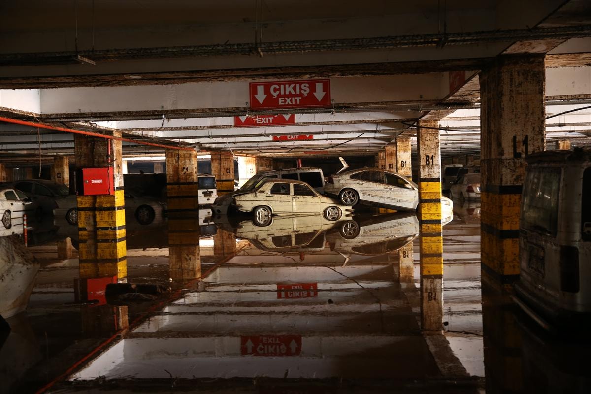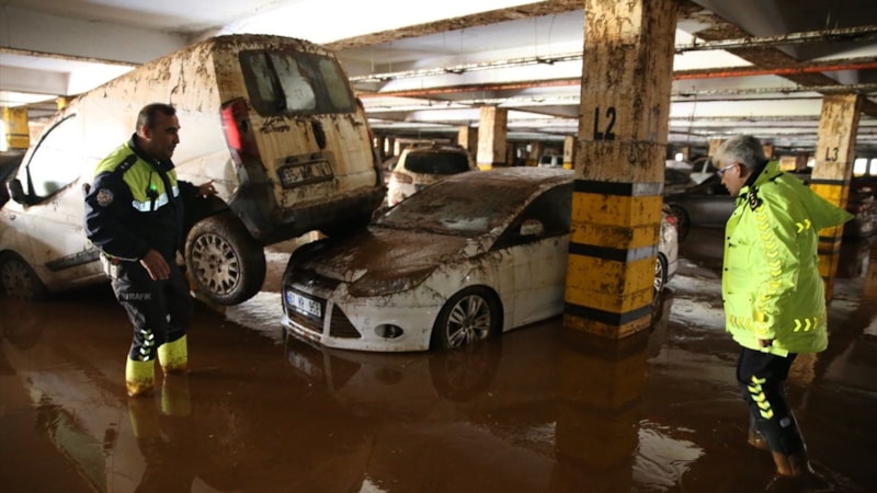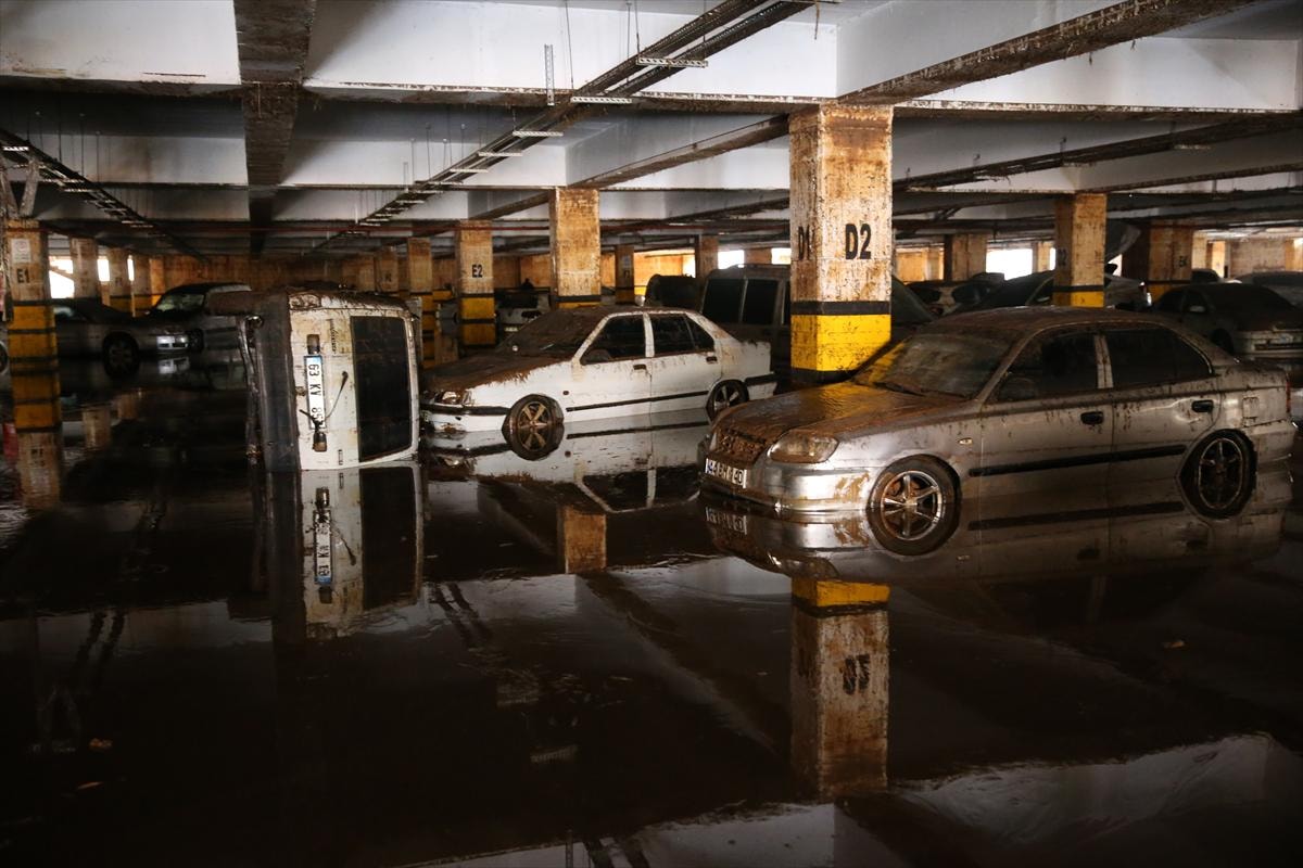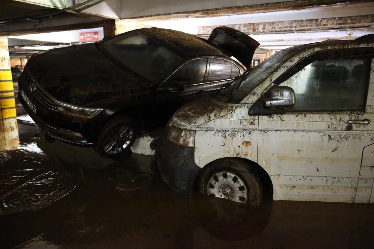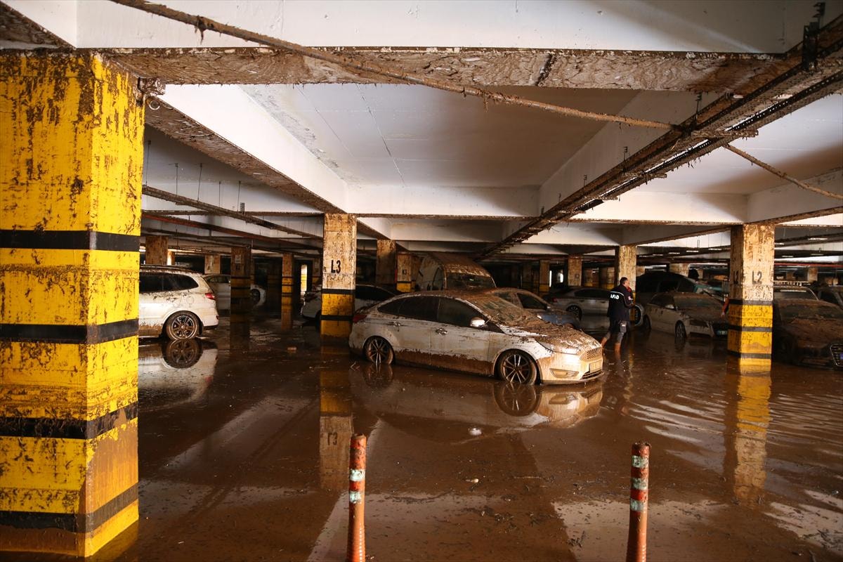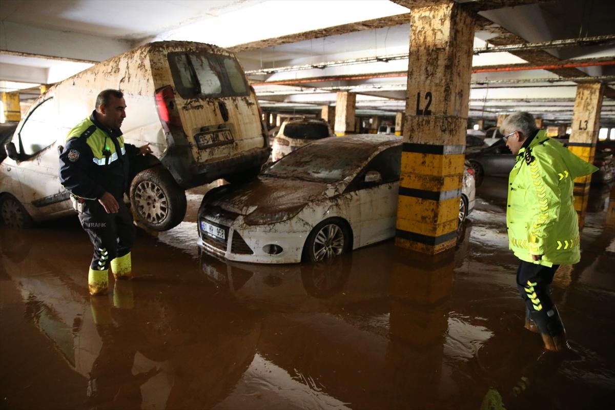 Birbirinin üzerine binen, yer değiştiren ve çamurla kaplanan araçların, temizliğin tamamlanmasının ardından çekiciler yardımıyla otoparktan çıkarılacağı belirtildi.
