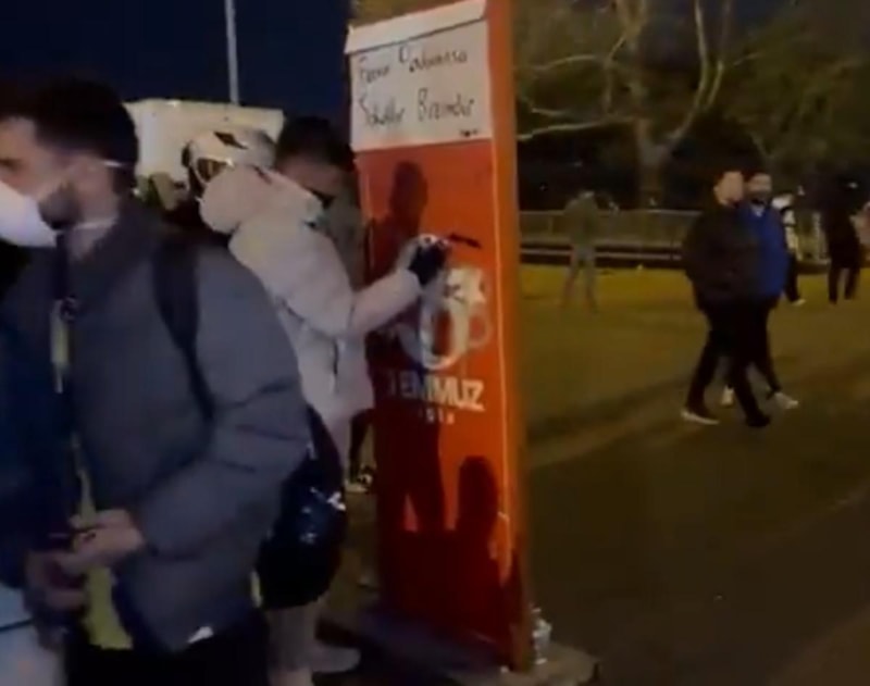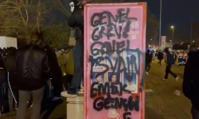 Ekrem İmamoğlu’nun gözaltına alınmasının ardından Saraçhane’de toplanan bir grup eylemci, 15 Temmuz şehitlerinin bulunduğu panodaki fotoğraflara sprey boya sıkarak "Genel grev, genel isyan" yazdı.