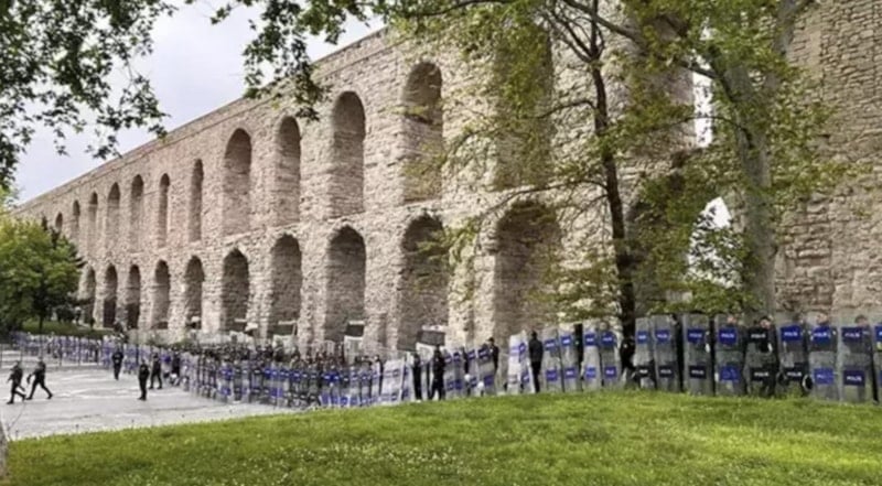 Bozdoğan Kemeri'nde güvenlik önlemi alan ve yolu bariyerlerle kapatan polis ekipleriyle sendika ve meslek örgütleri arasında gerginlik yaşandı.