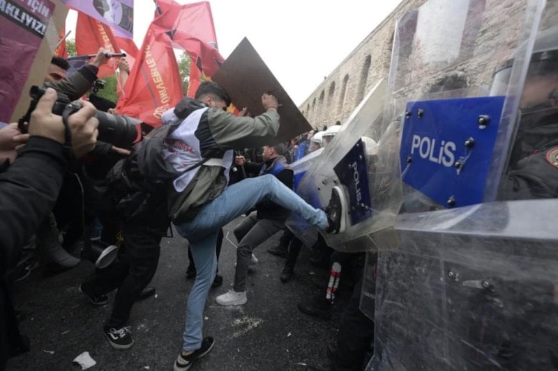 Ellerindeki bayrak sopalarıyla polise saldıran göstericiler, polisin tazyikli su ve biber gazıyla yaptığı müdahaleyle geri çekildi.
