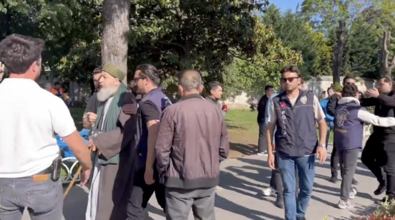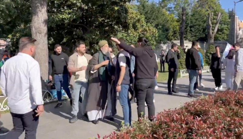 İBB'ye yönelik soruşturmalar kapsamında Saraçhane'de dün toplanarak çadır kuran gösterici grubun bölgeden geçen cübbeli sarıklı yaşlı bir adama 'Mustafa Kemal'in askerleriyiz' sloganları ile saldırdığı anlar kameralara yansıdı.