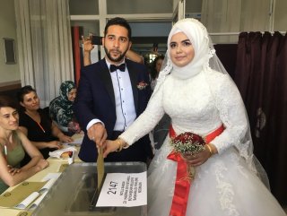 Sandık görevlilerinin “Düğüne biz de davetli miyiz?" sözleri üzerine çift "Evet” yanıtını verdi. Vatandaşların yoğun ilgi gösterdiği çift, daha sonra alkışlar eşliğinde okuldan ayrıldı.