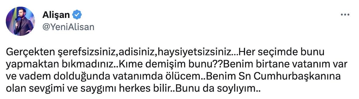 Gerçekten şerefsizsiniz, adisiniz, haysiyetsizsiniz… Her seçimde bunu yapmaktan bıkmadınız. Kime demişim bunu? Benim bir tane vatanım var ve vadem dolduğunda vatanımda öleceğim. Benim Sn. Cumhurbaşkanına olan sevgimi ve saygımı herkes bilir. Bunu da söyleyim.