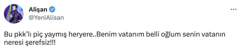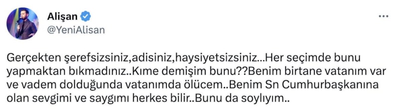 "Millet İttifakı iktidara gelirse, beni Türk vatandaşlığından çıkarın" dediği iddia edilen şarkıcı Alişan iddialara tepki gösterdi. Alişan yaptığı açıklamada "Benim vatanım belli senin vatanın neresi şerefsiz" ifadelerini kullandı.