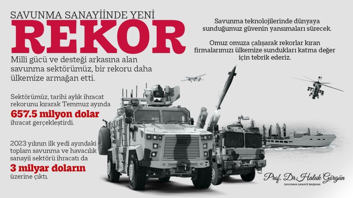 Milli gücü ve desteği arkasına alan savunma sektörümüz, bir rekoru daha ülkemize armağan etti. Sektörümüz, tarihi aylık ihracat rekorunu kırarak temmuz ayında 657.5 milyon dolar ihracat gerçekleştirdi. 2023 yılının ilk 7 ayındaki toplam savunma ve havacılık sanayii sektörü ihracatı da 3 milyar doların üzerine çıktı. Savunma teknolojilerinde dünyaya sunduğumuz güvenin yansımaları sürecek. Omuz omuza çalışarak rekorlar kıran firmalarımızı ülkemize sundukları katma değer için tebrik ederiz.