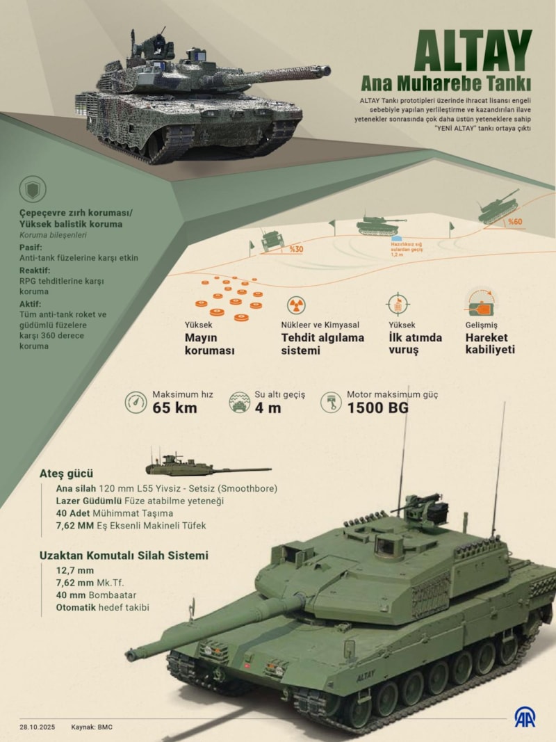 ALTAY Tankı prototipleri üzerinde ihracat lisansı engeli sebebiyle yapılan yerlileştirme ve kazandırılan ilave yetenekler sonrasında çok daha üstün yeteneklere sahip 'YENİ ALTAY' tankı ortaya çıktı.