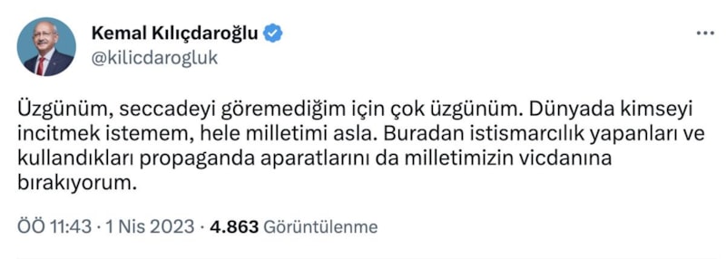 Seccadeye ayakkabılarıyla bastığı fotoğraf tepki üstüne tepki çeken Kemal Kılıçdaroğlu, "Göremediğim için çok üzgünüm" ifadeleri ile bir paylaşımda bulundu.