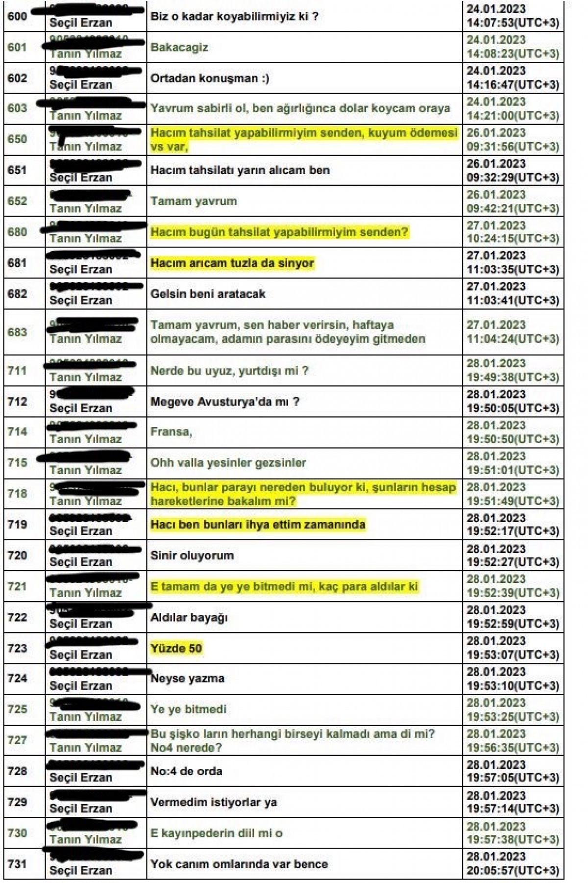 Mesajlarda, Seçil Erzan'ın kuzeni Tanın Yılmaz ile sık sık para alışverişi konusunda konuştuğu görüldü. O konuşmalardan bazıları ise şöyle;