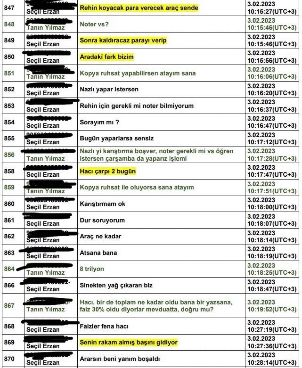 Öte yandan Tanın Yılmaz'dan para istemesi üzerine olumsuz dönüş alan Seçil Erzan'ın, Yılmaz'a aracını rehin vererek para alma teklifinde bulunduğu, sonrasında parayı ödeyip aracı geri alarak aradaki farkın kendilerine kar olarak kalacağı yönünde mesajlar attığı görülüyor.