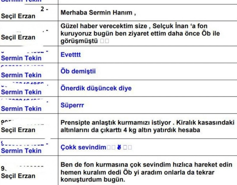 Konuşmalarda Seçil Erzan'ın; "Merhaba Sermin Hanım, Güzel haber verecektim size, Selçuk İnan'a fon kuruyoruz bugün ben ziyaret ettim daha önce Öb ile görüşmüştüm" şeklinde mesaj yazdığı, Sermin Tekin'in ise, “Evettt, Öb demişti Önerdik düşüncek diye, Süperrrö" şeklinde karşılık verdiği, Erzan'ın “Prensipte anlaştık kurmamızı istiyor. Kiralık kasasındaki altınlarını da çıkarttı 4 kg altın yatırdık hesaba" diye mesaj yazdığı, Tekin'in ise “Çokk sevindim" şeklinde mesaj yazdığı görülüyor.