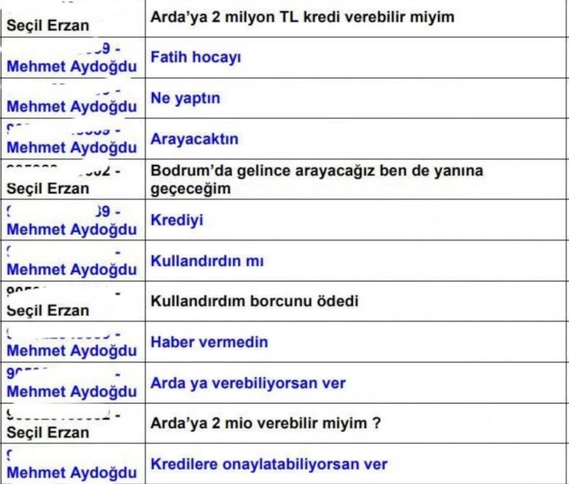 Seçil Erzan'ın mesajlaşmalarında Mehmet Aydoğdu'yla Arda Turan ve Fatih Terim'in kredileri hakkında konuşmaları dikkat çekti.