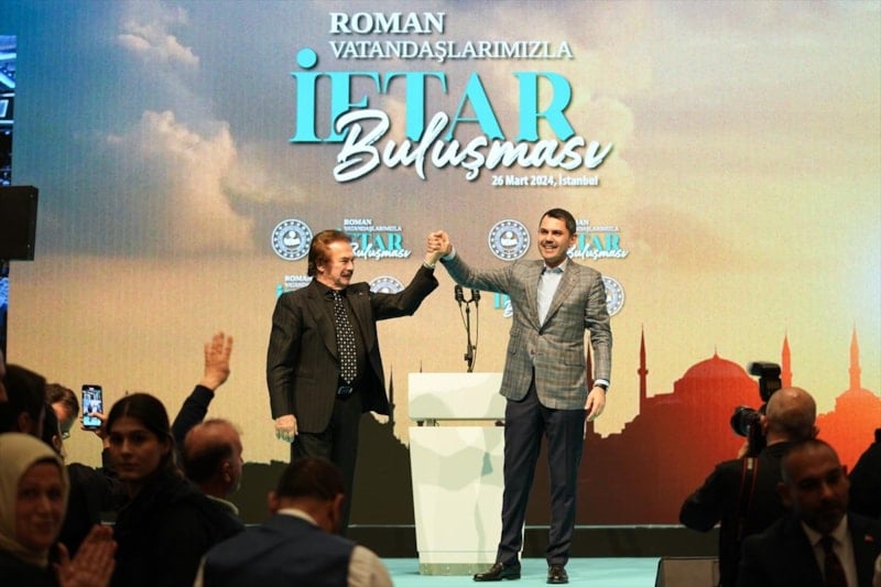 Cumhur İttifakı'nın İstanbul adayı Murat Kurum için şarkı yazarak hediye eden Orhan Gencebay, Roman Vatandaşlarımızla İftar Buluşması etkinliğine katıldı. Murat Kurum sahneye Orhan Gencebay ile çıkarak şarkıya eşlik etti.