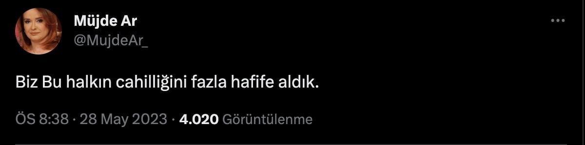 Seçim sonucunu beğenmeyen Müjde Ar, kendisi gibi düşünmeyen insanları aşağılamaya kalktı.