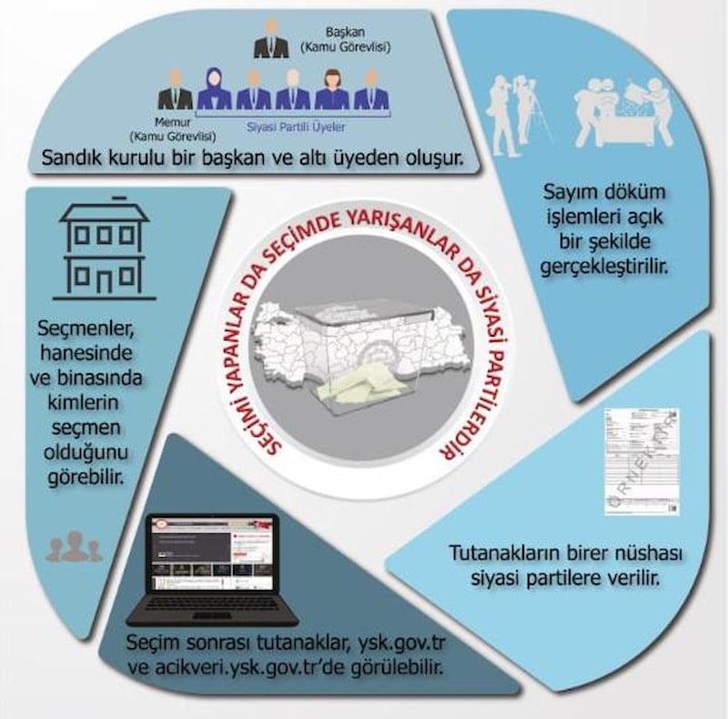 Tutanağın hemen orada vatandaşların göreceği şekilde asıldığı belirtildi. Oyların Seçim Bilişim Sistemi'ne (SEÇSİS) girilmesi ve birleştirilmesinin de ilçe seçim kurullarında siyasi parti temsilcileri huzurunda gerçekleştiği kaydedildi. SEÇSİS'e girilen bu verilerin YSK'ya ulaştığı, eş zamanlı olarak seçime katılan siyasi partilerle paylaşıldığı ifade edildi.