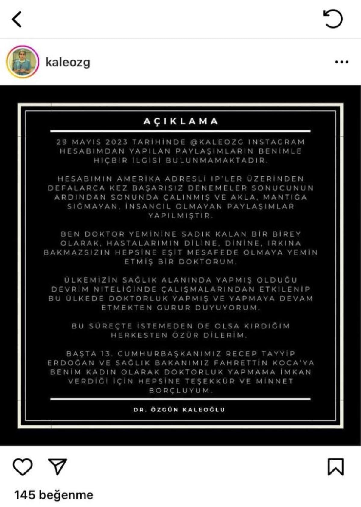 Hesabımdan yapılan paylaşımların benimle hiçbir ilgisi bulunmamaktadır. Hesabım Amerika adresli IP'ler üzerinden defalarca kez başarısız deneme sonucunun ardından sonunda çalınmış ve akla, mantığa sığmayan, insancıl olmayan paylaşımlar yapılmıştır. Ben doktor yeminine sadık kalan bir birey olarak hastalarımın diline, dinine, ırkına bakmazsızın hepsine eşit mesafede olmaya yemin etmiş bir doktorum. Ülkemizin sağlık alanında yapmış olduğu devrim niteliğinde çalışmalarından etkilenip bu ülkede doktorluk yapmış ve yapmaya devam etmekten gurur duyuyorum. Bu süreçte istemeden de olsa kırdığım herkesten özür dilerim. Başta 13. Cumhurbaşkanımız Recep Tayyip Erdoğan ve Sağlık Bakanımız Fahrettin Koca'ya benim kadın olarak doktorluk yapmama imkan verdiği için hepsine teşekkür ve minnet borçluyum.