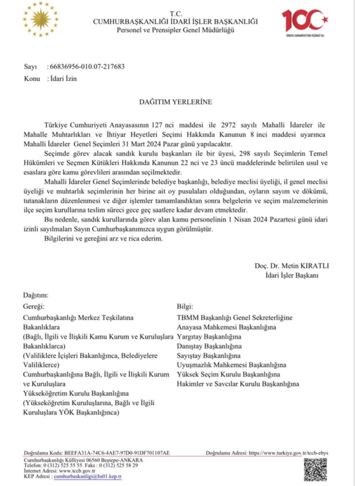 Bu nedenle, sandık kurullarında görev alan kamu personelinin 1 Nisan 2024 Pazartesi günü idari izinli sayılmaları Sayın Cumhurbaşkanımızca uygun görülmüştür."