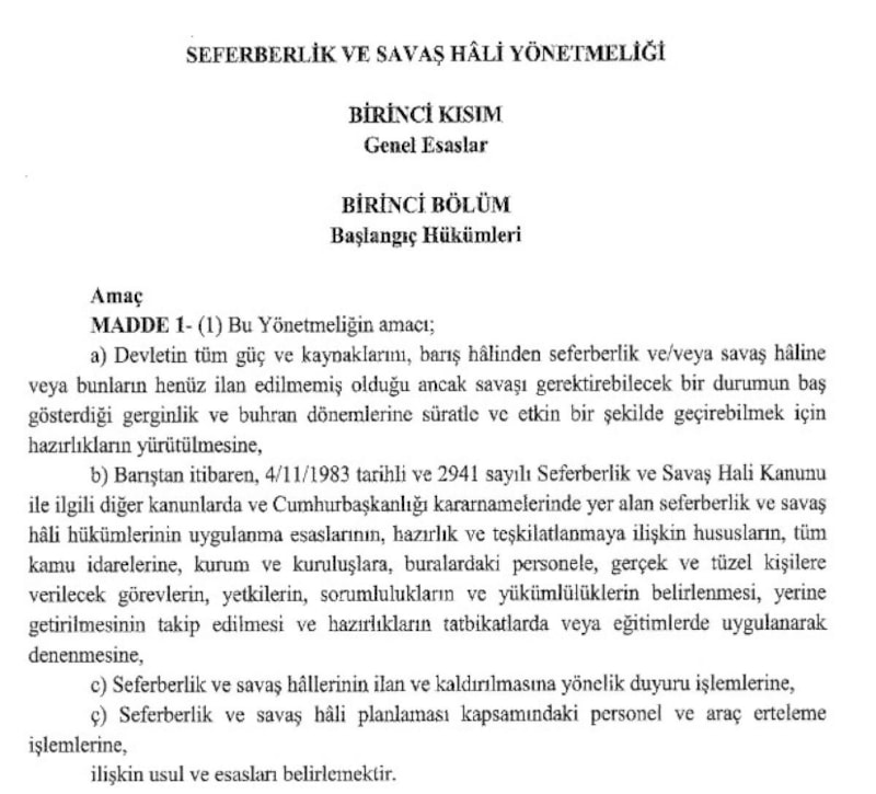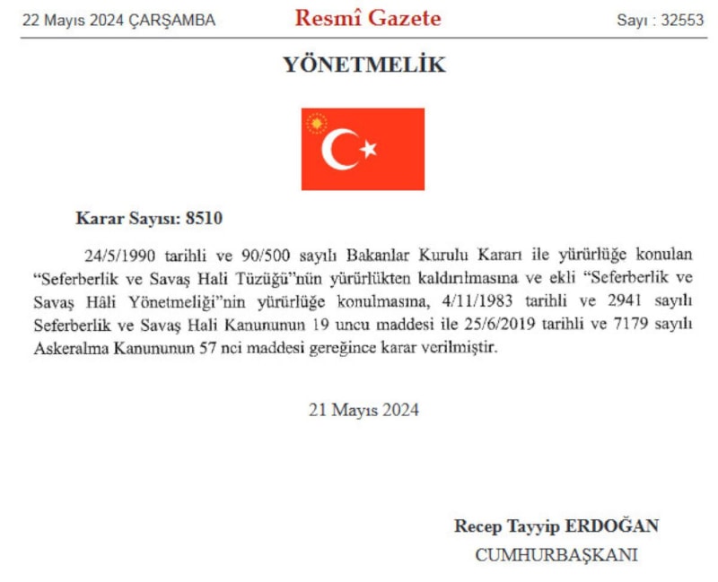 Cumhurbaşkanı Recep Tayyip Erdoğan'ın imzasıyla, Seferberlik ve Savaş Hali Yönetmeliği Resmi Gazete'de yayınlanarak yürürlüğe girdi.