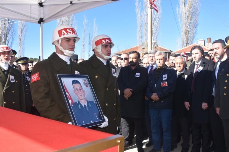 Cenaze törenine katılanlar tekbir getirerek, "Şehitler ölmez, vatan bölünmez" ve "Kahrolsun PKK" sloganı attı.