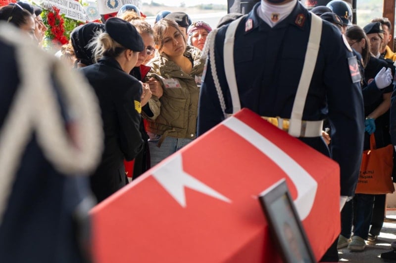 Cenaze namazından önce tabutun başına gelen şehidin annesi Zeliha Eryılmaz ve eşi Ayten Eryılmaz gözyaşı döktü.