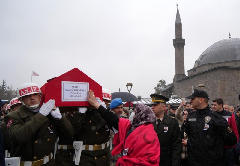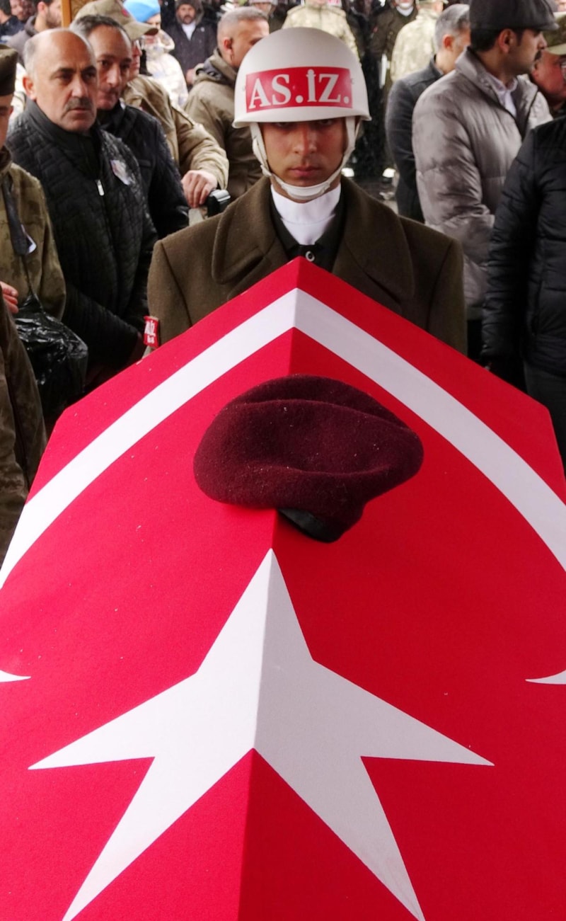 Piyade Uzman Çavuş Nurettin Tokyürek'in Türk bayrağına sarılı tabutunun üzerine şehidin bordo beresi konuldu.