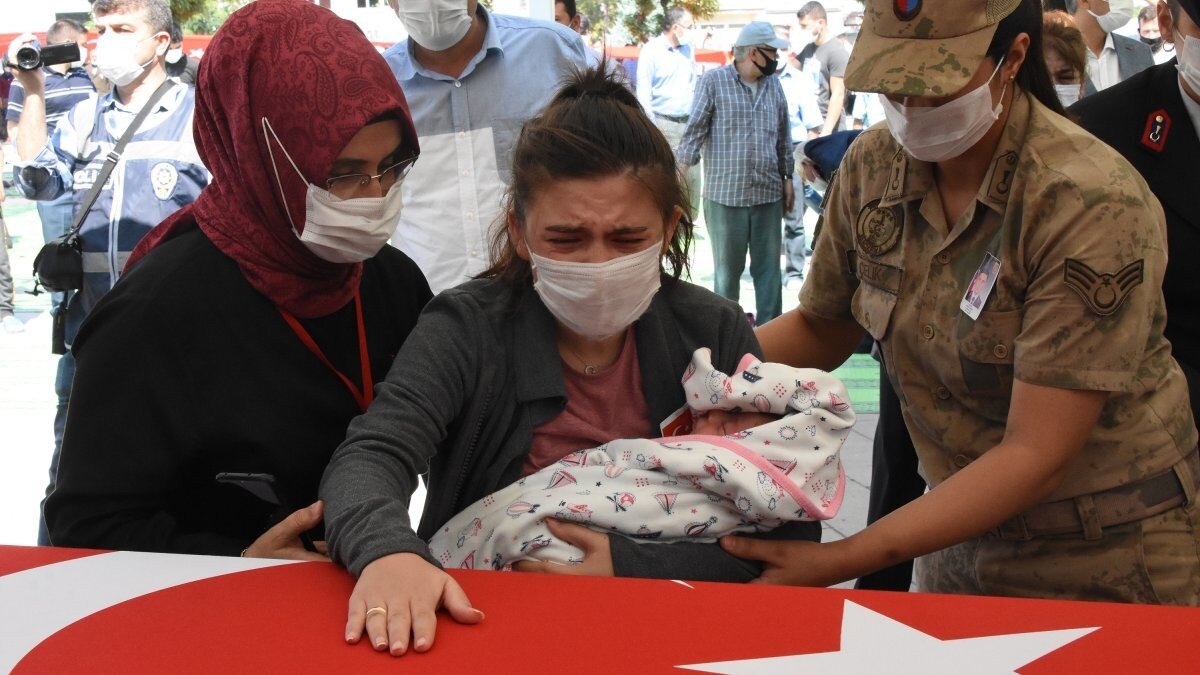 Güçlükle ayakta duran ve gözyaşlarını tutamayan şehit eşinin, kundaktaki bebeğinin yüzünü açıp babasının fotoğrafını gösterdiği anlar yürek burktu.