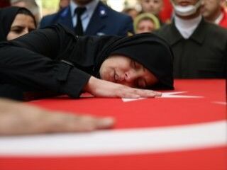 Şehidin eşi Yasemin Çobanoğlu, babası Cüneyt ve askeri kamuflaj giyen annesi Sevim Çobanoğlu tabuta sarılıp, şehidin fotoğrafını öptü.