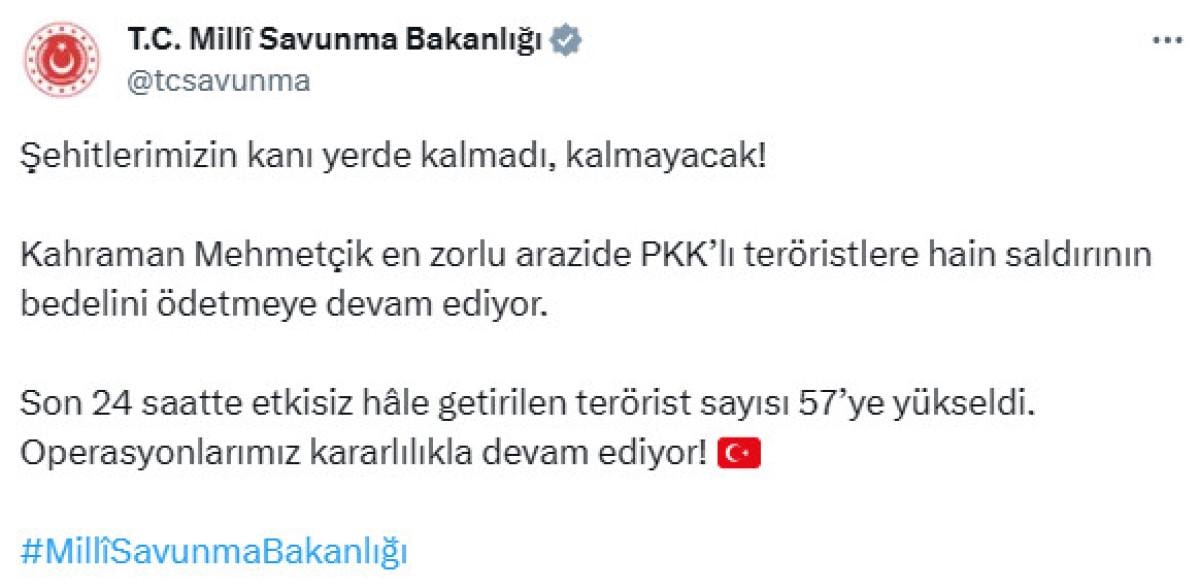 Son 24 saatte etkisiz hâle getirilen terörist sayısı 57’ye yükseldi. Operasyonlarımız kararlılıkla devam ediyor!