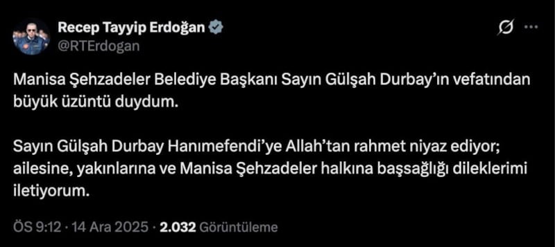 Durbay'ın ölümü ile ilgili açıklama yapan Cumhurbaşkanı Recep Tayyip Erdoğan, "Manisa Şehzadeler Belediye Başkanı Sayın Gülşah Durbay’ın vefatından büyük üzüntü duydum.