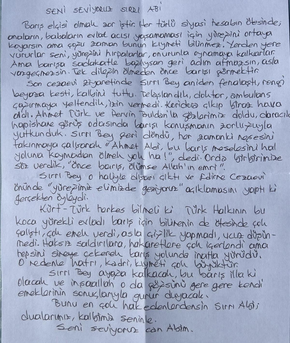 Son cezaevi ziyaretinde Sırrı Bey aniden fenalaştı, rengi beyaza kesti, kalbini tuttu. Telaşlandık, doktor, ambulans çağırmaya yeltendik, izin vermedi. Koridora çıkıp biraz hava aldı. Ahmet Türk ve Pervin Buldan'la gözlerimiz doldu, daracık hapishane görüş odasında barışı konuşmanın zorluğuyla yutkunduk. Sırrı Bey geri döndü, her zamanki neşesini takınmaya çalışarak 'Ahmet Abi, bu barış meselesini hal yoluna koymadan ölmek yok ha!' dedi. Orada birbirimize söz verdik, 'Önce barış, ölümse Allah'ın emri.'