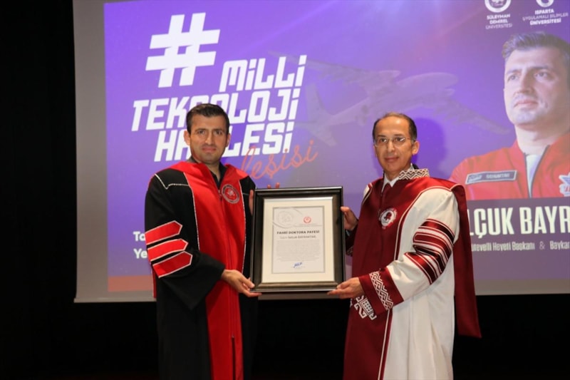Konuşmasının ardından öğrencilerin sorularını yanıtlayan Selçuk Bayraktar'a, Süleyman Demirel Üniversitesince fahri doktora payesi verildi.