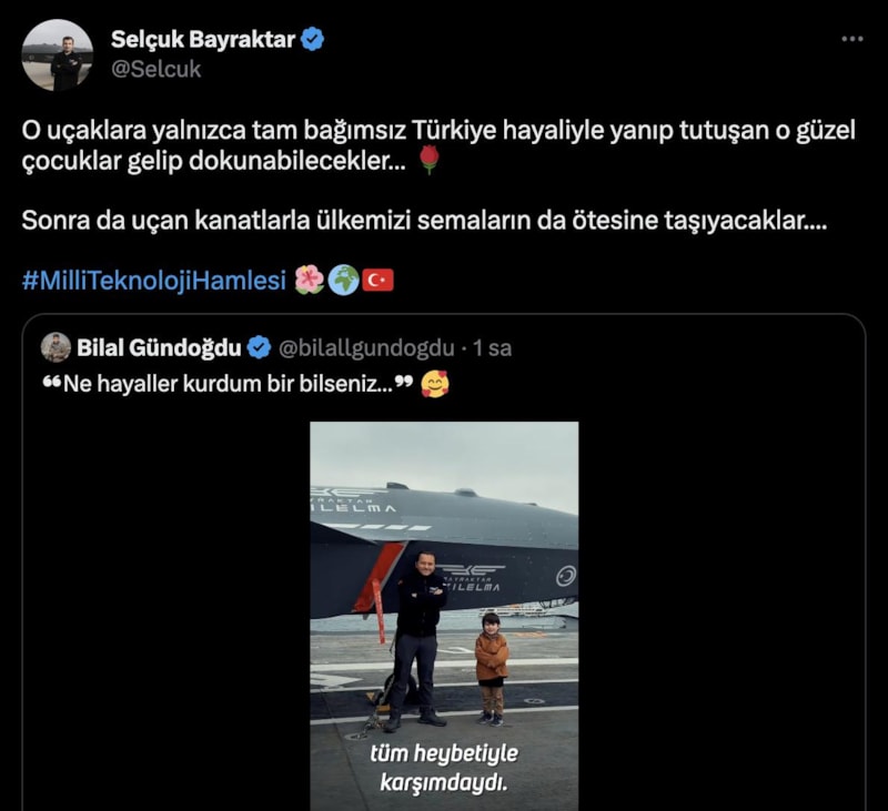 Baykar Yönetim Kurulu Başkanı Selçuk Bayraktar, sosyal medya hesabından Selimhan Gündoğdu ile babası Bilal Gündoğdu'nun TCG Anadolu macerasını paylaşarak, "O uçaklara yalnızca tam bağımsız Türkiye hayaliyle yanıp tutuşan o güzel çocuklar gelip dokunabilecekler. Sonra da uçan kanatlarla ülkemizi semaların da ötesine taşıyacaklar" notunu düştü.