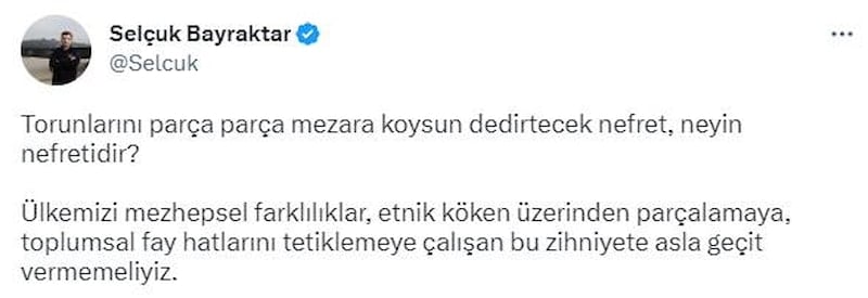 Kılıçdaroğlu destekçisi bir kadının sokak röportajında Cumhurbaşkanı Erdoğan hakkında söylediği nefret söylemlerine Selçuk Bayraktar "Torunlarını parça parça mezara koysun dedirtecek nefret, neyin nefretidir?" yanıtını verdi.