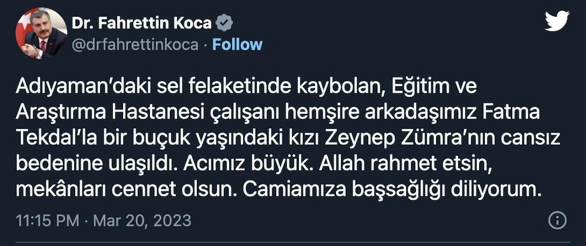 Bakan Koca, paylaşımında, "Adıyaman'daki sel felaketinde kaybolan, Eğitim ve Araştırma Hastanesi çalışanı hemşire arkadaşımız Fatma Tekdal'la bir buçuk yaşındaki kızı Zeynep Zümra'nın cansız bedenine ulaşıldı. Acımız büyük. Allah rahmet etsin, mekanları cennet olsun. Camiamıza başsağlığı diliyorum" ifadelerini kullandı.