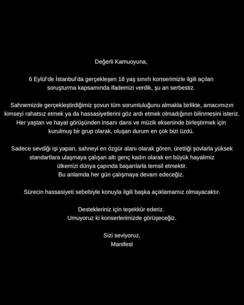 6 Eylül’de İstanbul’da gerçekleşen 18 yaş sınırlı konserimizle ilgili açılan soruşturma kapsamında ifademizi verdik, şu an serbestiz.