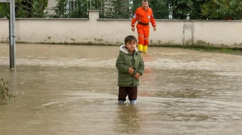 Çocuğunu oyun oynaması için su altında kalan sitenin bahçesine çıkaran Emre Nurhan, “Anın tadını çıkarıyoruz, çocuğun evde canı sıkılmıştı. Ben de eğlensin diye buraya getirdim." dedi.
