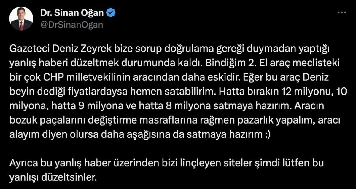 "Gazeteci Deniz Zeyrek bize sorup doğrulama gereği duymadan yaptığı yanlış haberi düzeltmek durumunda kaldı. Bindiğim 2.el araç Meclis'teki birçok CHP milletvekilinin aracından daha eskidir. Eğer bu araç Deniz Bey'in dediği fiyatlardaysa hemen satabilirim. Hatta bırakın 12 milyonu, 10 milyona, hatta 9 milyona ve hatta 8 milyona satmaya hazırım. Aracın bozuk parçalarını değiştirme masraflarına rağmen pazarlık yapalım, aracı alayım diyen olursa daha aşağısına da satmaya hazırım :) Ayrıca bu yanlış haber üzerinden bizi linçleyen siteler şimdi lütfen bu yanlışı düzeltsinler."