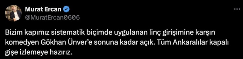 Bizim kapımız sistematik biçimde uygulanan linç girişimine karşın komedyen Gökhan Ünver’e sonuna kadar açık. Tüm Ankaralılar kapalı gişe izlemeye hazırız.