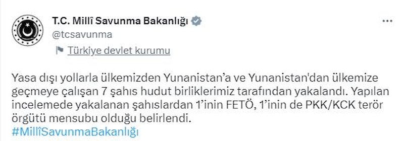 Yasa dışı yollarla ülkemizden Yunanistan’a ve Yunanistan'dan ülkemize geçmeye çalışan 7 şahıs hudut birliklerimiz tarafından yakalandı. Yapılan incelemede yakalanan şahıslardan 1’inin FETÖ, 1’inin de PKK/KCK terör örgütü mensubu olduğu belirlendi.