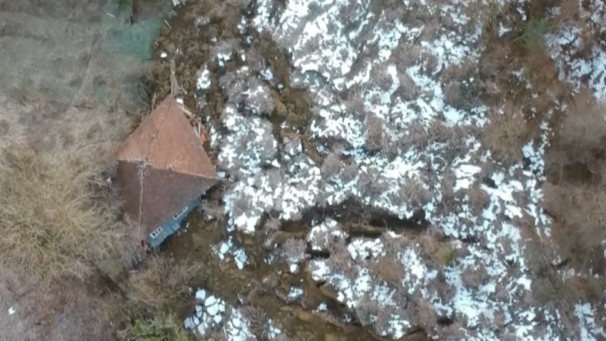 Sinop'un Türkeli ilçesinde karların erimesiyle kayan dev toprak parçası, evleri önüne katarak sürükledi.