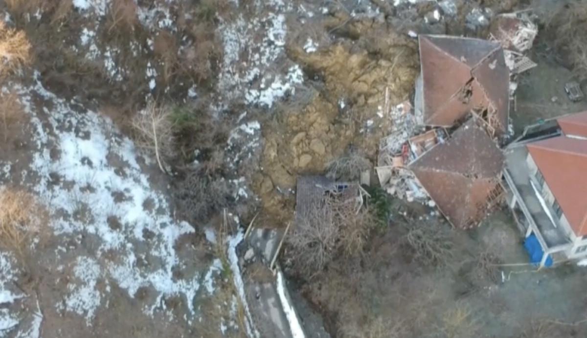Görüntülerde, dev toprak kitlesinin dağdan kayarak evleri sürüklemiş hali dikkat çekiyor.