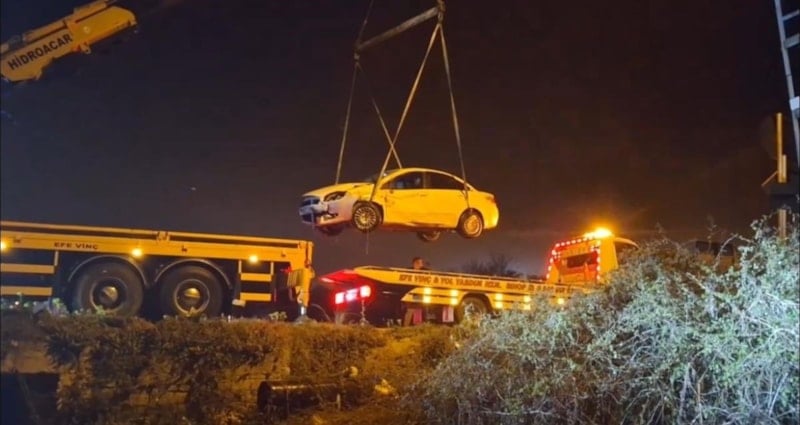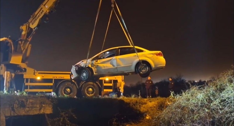 Otomobilin kanaldan çıkarılabilmesi için vinç kullanıldı.