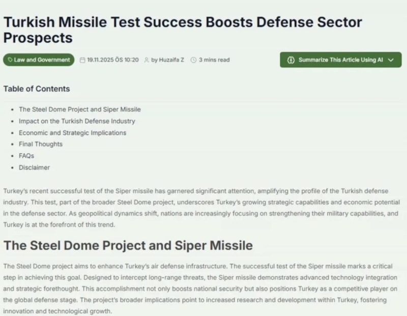 Avustralya merkezli analiz platformu Meyka'da SİPER 1'in başarılı test atışı ayrıntılarıyla analiz edilirken, yeni milli silahın Çelik Kubbe için önemine, küresel etkisine ve milli savunma sanayisinin ekonomiye katkılarına dikkat çekildi.