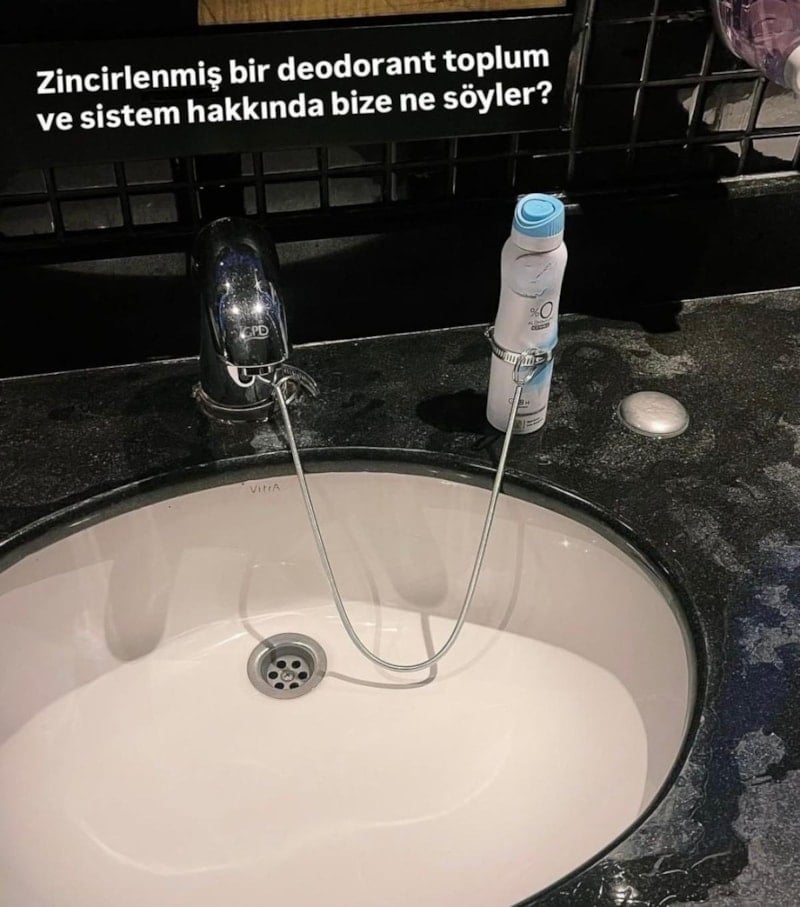 Bir alışveriş merkezinde çekildiği iddia edilen görüntü, sosyal medyada "pes" dedirtti. Müşteriler için bırakılan deodorant, çalınmaması için musluğa zincirlendi.