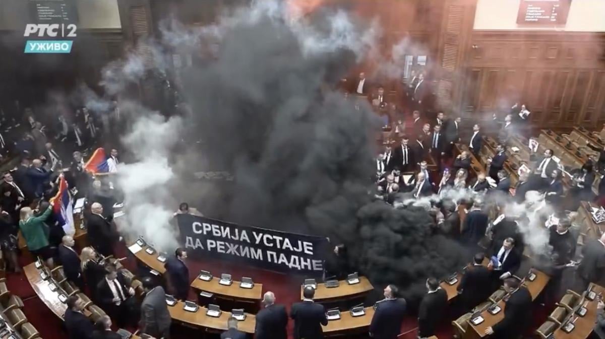 Sırp İlerici Partisi (SNS) liderliğindeki iktidar koalisyonu meclis gündemini onayladıktan sonra bazı muhalefet milletvekilleri, yerlerinden fırlayarak meclis başkanının kürsüsüne doğru ilerledi.