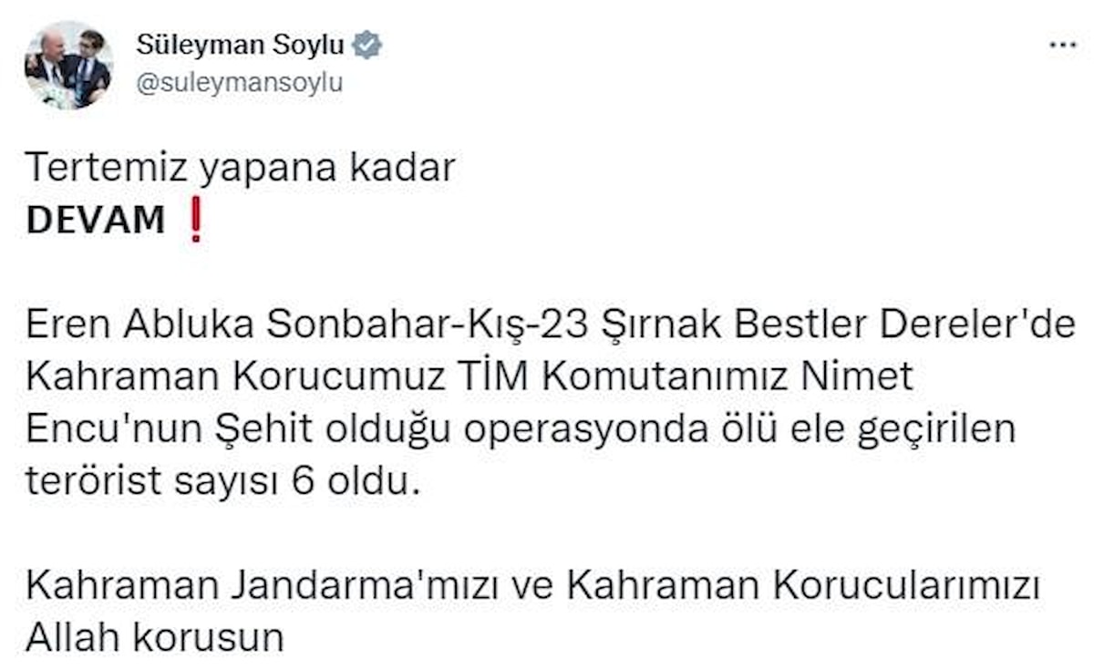 "Tertemiz yapana kadar devam. Eren Abluka Sonbahar-Kış-23 Şırnak Bestler Dereler'de Kahraman Korucumuz TİM Komutanımız Nimet Encu'nun Şehit olduğu operasyonda ölü ele geçirilen terörist sayısı 6 oldu. Kahraman Jandarma'mızı ve Kahraman Korucularımızı Allah korusun"