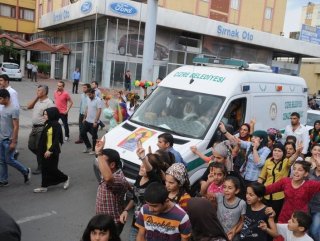 Cizre Belediyesi'ne ait araçla ilçeye götürülen PKK'lının cenazesi, sloganlar eşliğinde defnedildi. Cizre Belediyesi'nin aracındaki PKK bayrağı da dikkatlerden kaçmadı.
