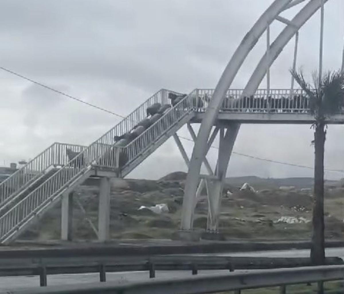 Yolun diğer tarafına geçmek isteyen koyunlar, hiç tereddüt etmeden yayalar için yapılan üst geçidi kullandı.