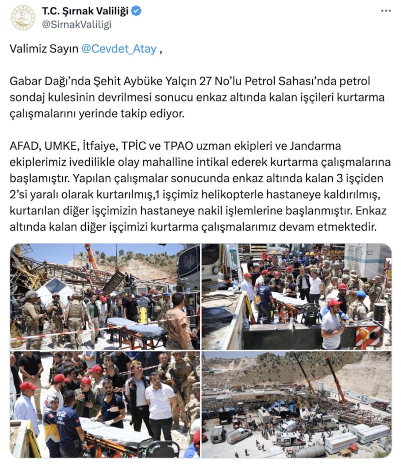 Gabar Dağı'ndaki Şehit Aybüke Yalçın Petrol arama sahasında petrol arama sahasında sondaj kulesinin devrildiği bildirildi. Enkaz altında kalan 3 işçilerin çıkarılması için çalışma başlatıldı. İki işçi erkazdan yaralı çıkartılırken, bir mühendis ise hayatını kaybetti.
